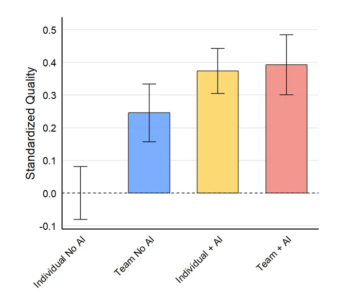 - Researchers from Harvard and Wharton also found that P&G workers using AI showed a significant improvement in the quality of their work, with AI effectively replicating the performance benefits of having a human teammate. AI enabled individuals and teams to work 12-16% faster and helped bridge knowledge gaps, enabling amateurs to act more like experts. Interestingly, individuals working with AI had emotional experiences comparable to or better than those working in human teams.